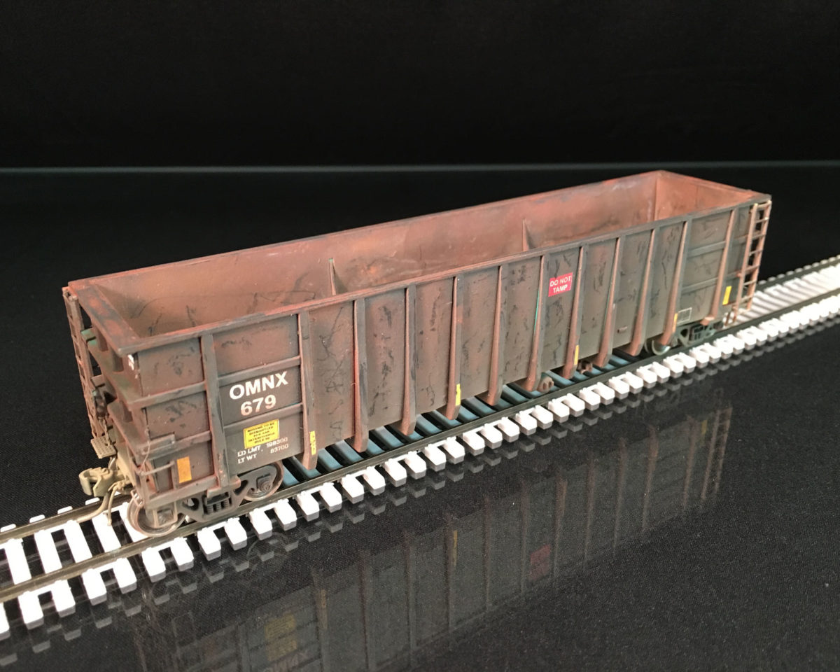The model is heavily weathered, AEI tags, Hi-Tech air hoses, and Kadee couplers.
