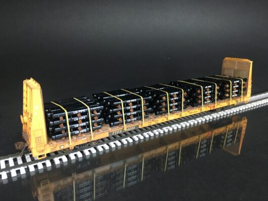 This model features 10 lifts of 15” iron pipe, wood dunnage, wood bulkhead covers, scale plywood, ratchet appliances, Plano photo-etched brake platforms, AEI tags, High Tech air hoses, scale banding, metal grab irons, and Kadee couplers. This model is lightly weathered.
