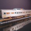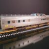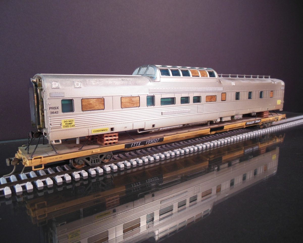 This model features a BLI Vista dome car that has been loaded for transport to a new owner. Broken windows have been covered with plywood. 20 tie downs chains and scale dunnage secure the car to a steel deck. Both models are lightly weathered.