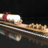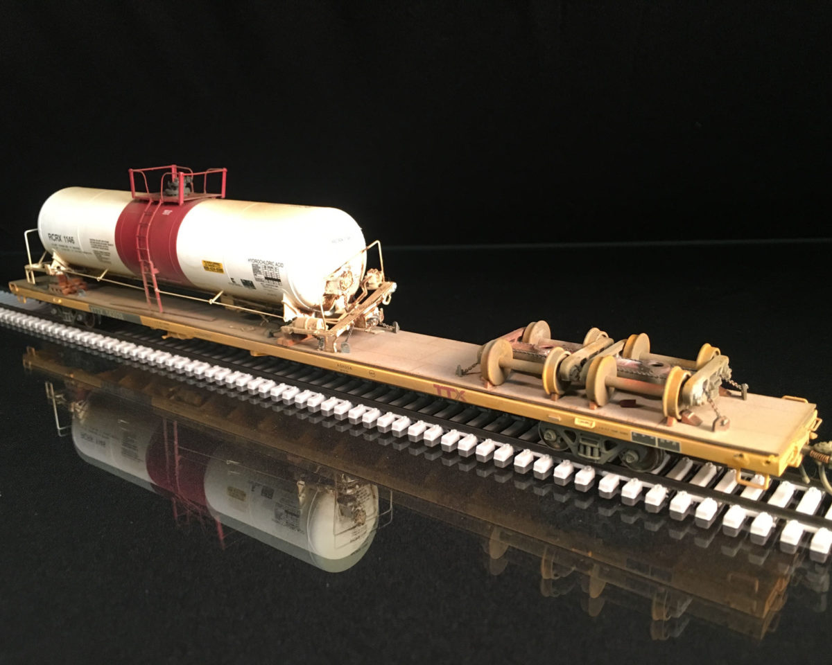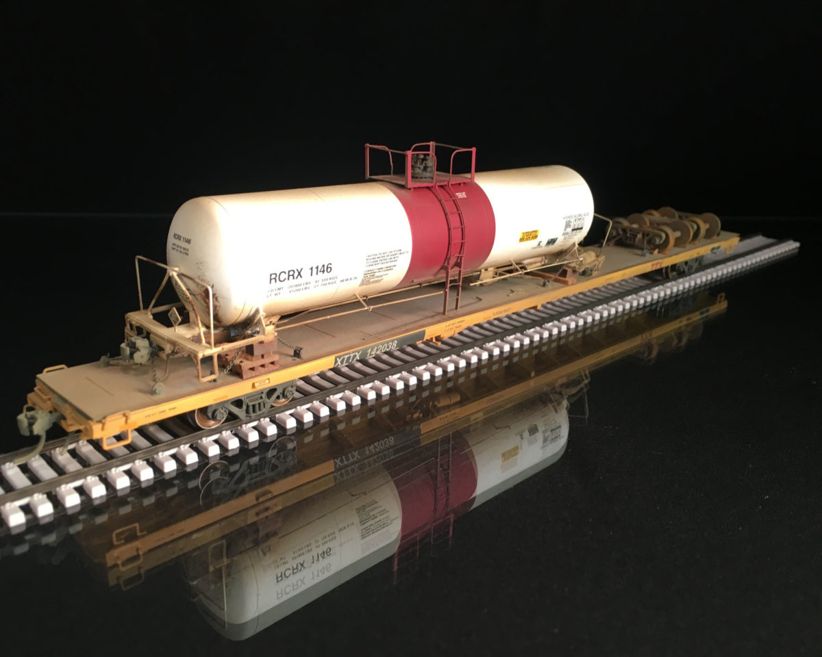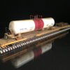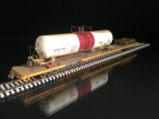 This model features a wreck damaged tank car secured to the deck of an 89’ flatcar, scale chain, AEI tags, new steel deck, and Kadee couplers.