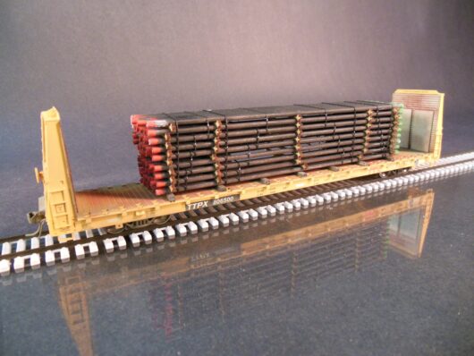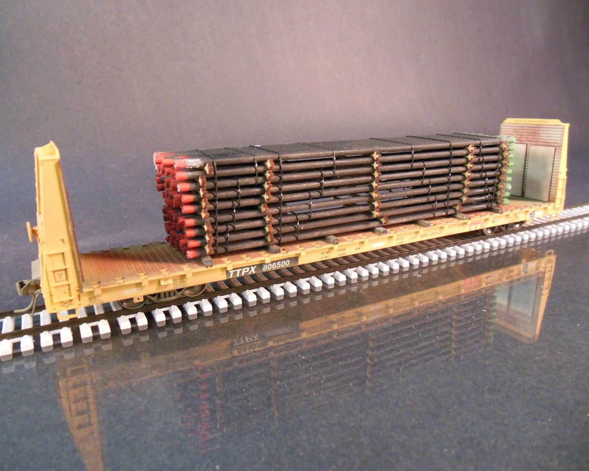 This model features a load of steel drill pipe, laser cut wood bulkhead covers, AEI tags, Plano photo-etched brake platforms, Hi-Tech air hoses, and Kadee couplers. This model is lightly weathered.