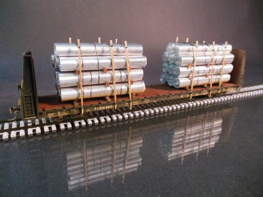 This model features 2 lifts of steel corrugated pipe, AEI tags, Plano photo-etched brake platforms, Hi-Tech air hoses, laser cut steel deck, and Kadee couplers. This model is lightly weathered.