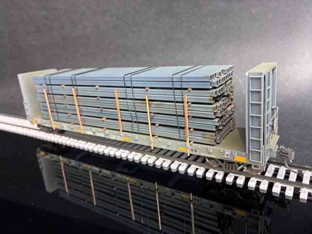 This model features a floating load of new steel box beams, High Tech air hoses, AEI tags, and Kadee couplers. This model is lightly weathered.