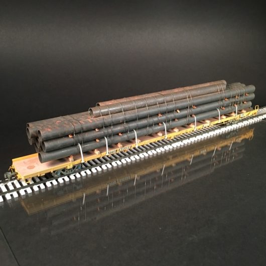 This model features K&S thin wall aluminum tubing weathered as raw spiral welded pipe, laser cut dunnage, ratchet appliance, scale banding, AEI tags, and Kadee couplers. This model is lightly weathered.