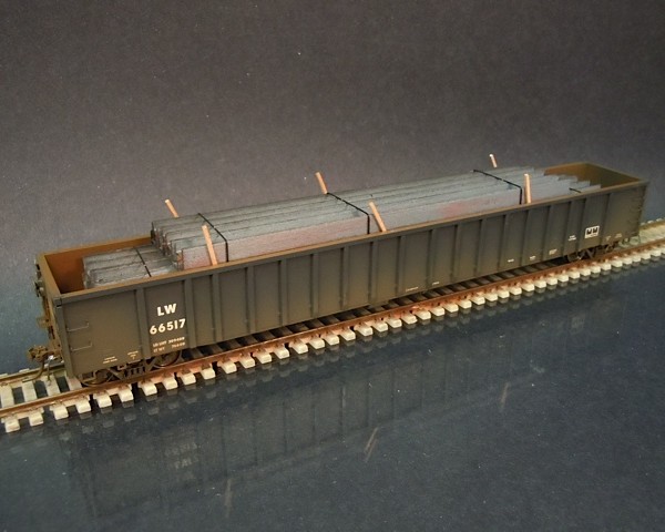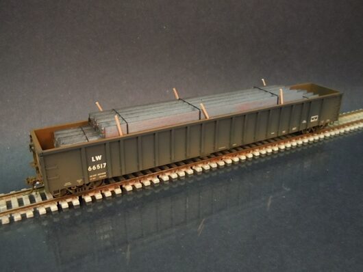 This model feathers a load of steel H-columns, Hi-Tech air hoses, AEI tags, and Kadee couplers.