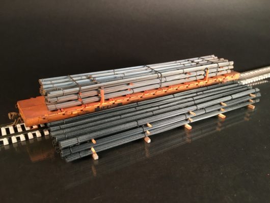 Atlas HO scale bulkhead flatcar with graphite electrodes