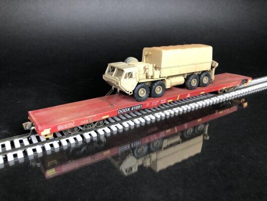 Protoloads HO Scale 68’ Department Of Defense Flatcars With 8 Wheel Drive Transport Vehicle