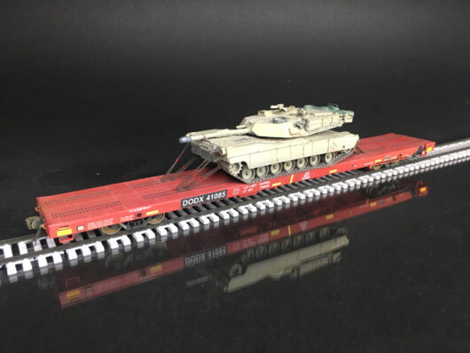 This model features an Abrams tank, muzzle covering, High Tech air hoses, metal grab irons, scale chains, AEI tags, and Kadee couplers. This model is lightly weathered.