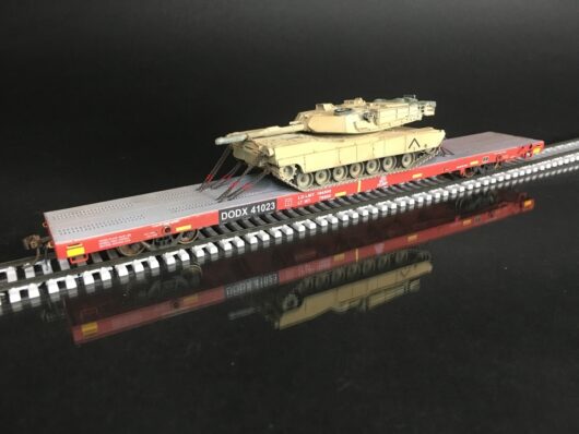 This model features an Abrams tank, muzzle covering, High Tech air hoses, metal grab irons, scale chains, AEI tags, and Kadee couplers. This model is lightly weathered.