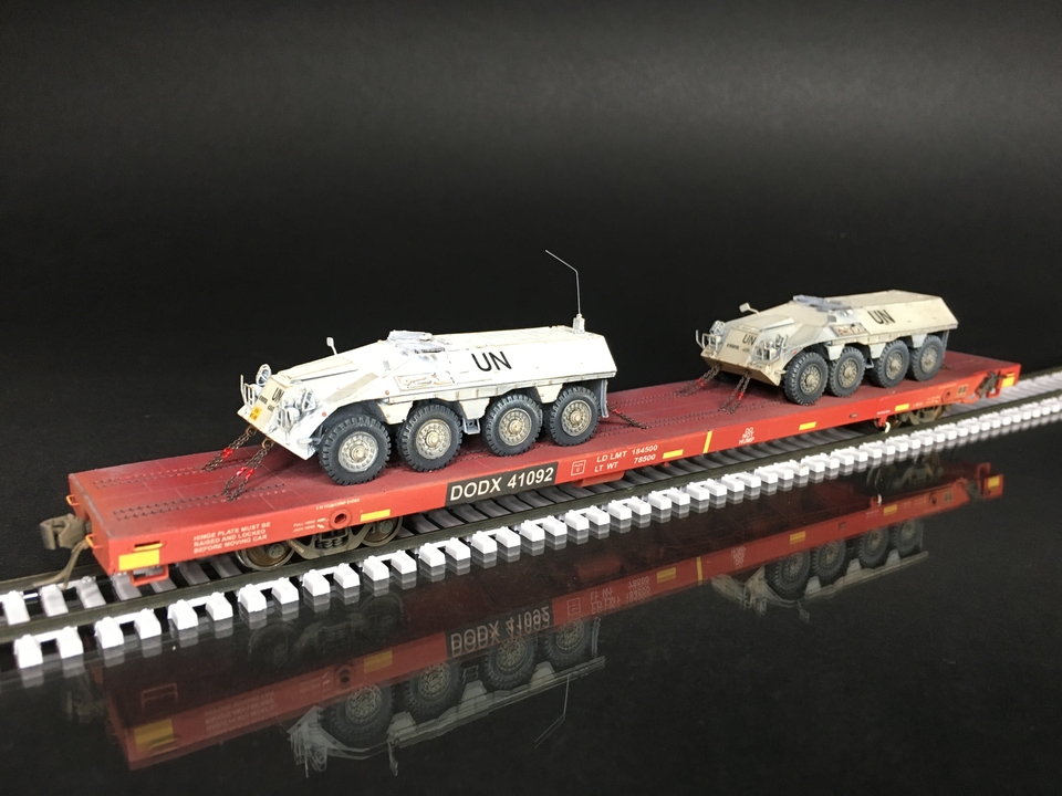 Walthers HO scale 60’ flatcar with John Deere equipment