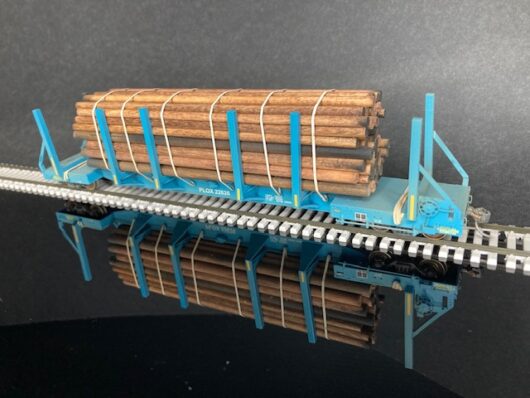 This model features metal grab irons, ratchet appliances, AEI tags, and Kadee couplers. The model is lightly weathered.