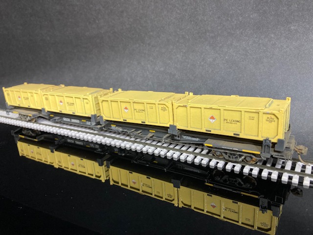 This model features custom paint, decals, 4 28 cubic foot steel containers, AEI tags, and Kadee couplers. This model is lightly weathered.
