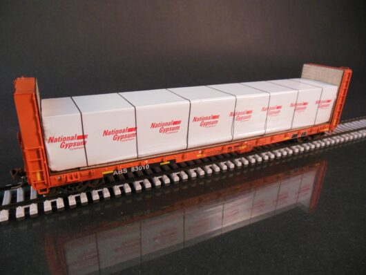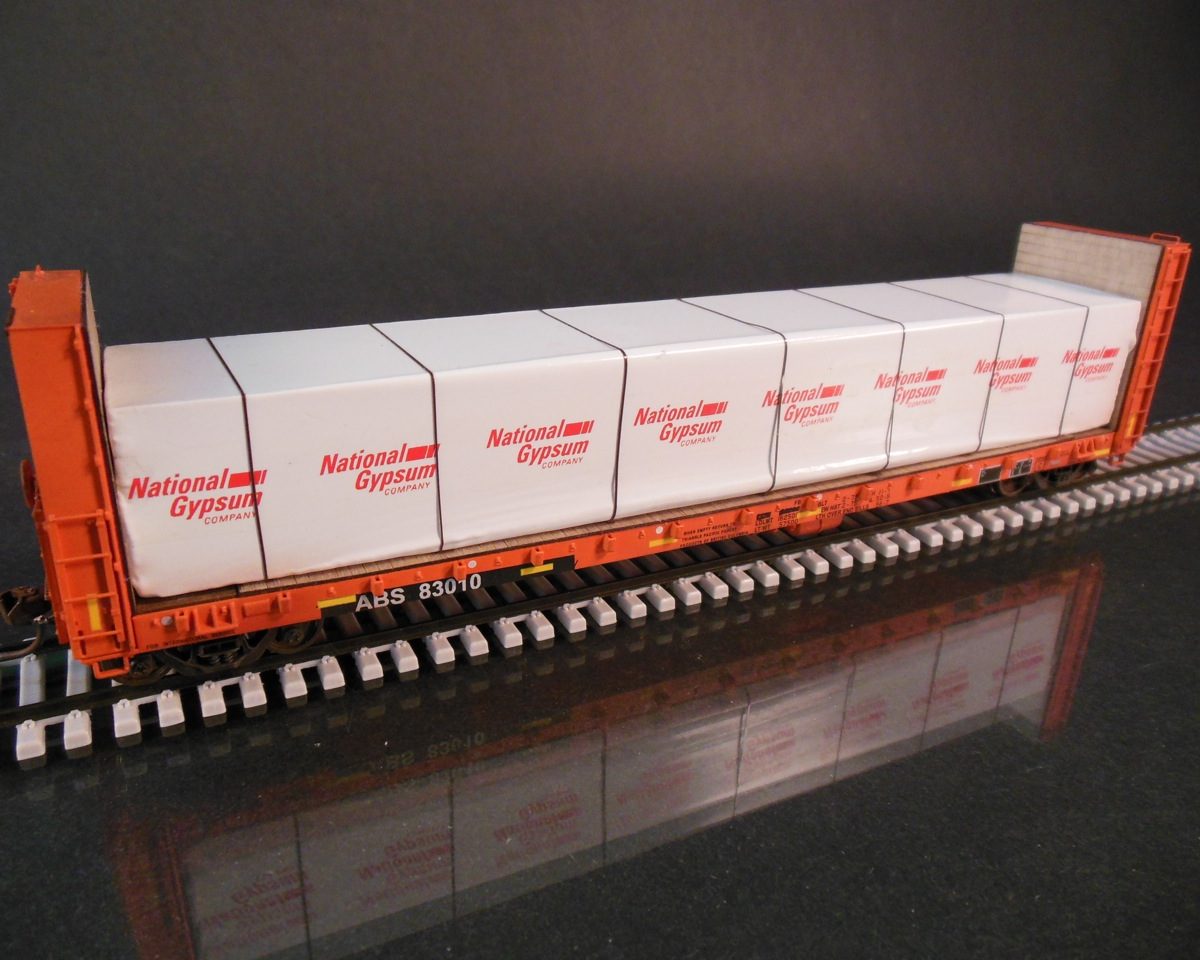 This model features a load of National Gypsum wall board, Hi-Tech air hoses, AEI tags, and Kadee couplers. This model is lightly weathered.