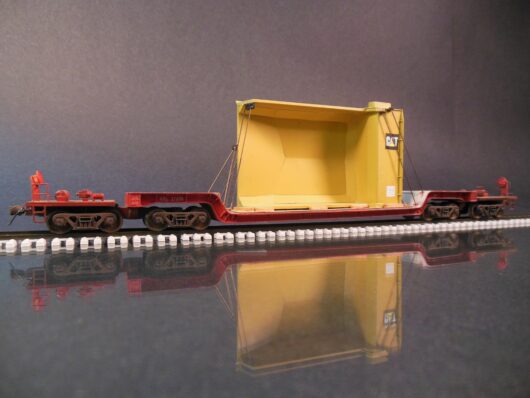 This model features a new extended deck, brass Caterpillar dump truck bed, AEI tags, Hi-Tech air hoses, and Kadee couplers. Model is lightly weathered.