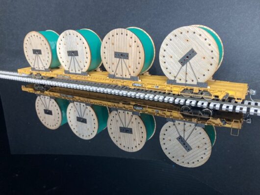This model features a load 4 15’ wooden spools of Fiberspar pipe for the gas industry, AEI tags and Kadee couplers. This model is lightly weathered.