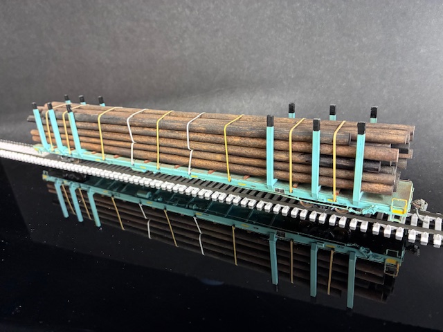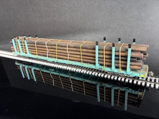 This model features a load of new treated utility poles, ratchet strap appliances, scale banding, AEI tags, and Kadee couplers. This model is lightly weathered.