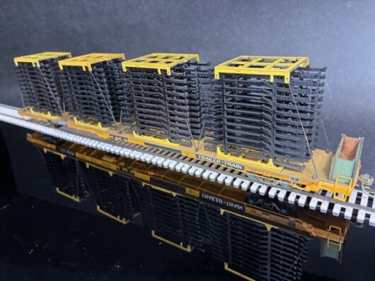 This model features 10 lifts of hydro formed truck frames, scale tie downs, new steel deck, AEI tags, and Kadee couplers. This model is lightly weathered.