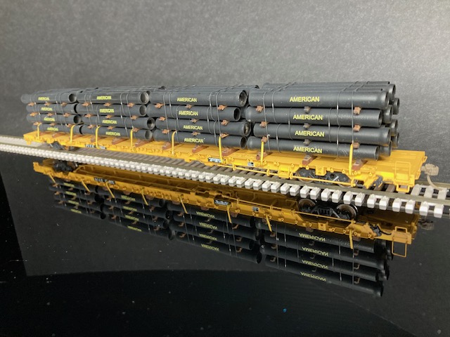 This model features 4 lifts of new American Pipe Company ductile iron pipe, wood dunnage, ratchet appliances, AEI tags, and Kadee couplers. This model is lightly weathered.