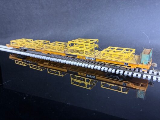 This model features a set of 6 truck frame tie down racks, new steel deck, AEI tags and Kadee couplers. This model is lightly weathered.