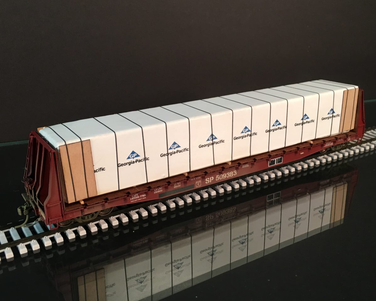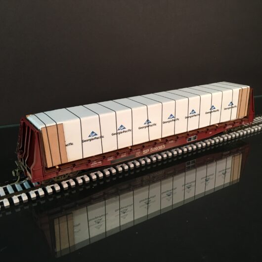 This model features a shrink-wrapped load of wall board, laser cut wood deck, double sided wood bulkhead covers, lube plates, AEI tags, and Kadee couplers. This model is lightly weathered